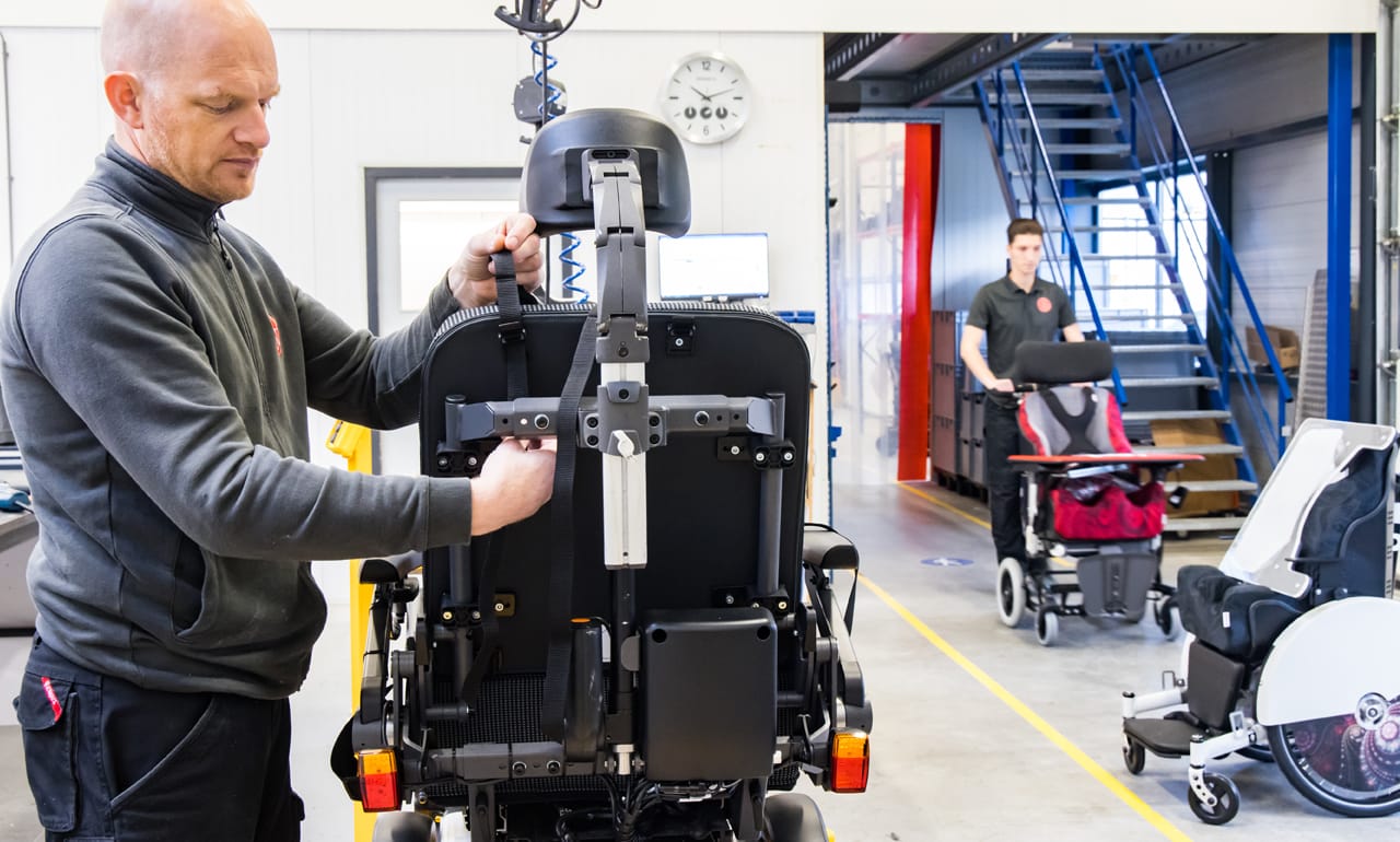 De Alpine orthesen worden veelal in onze werkplaats op de rolstoel gemonteerd. De meeste accessoires worden ook in huis vervaardigd. Ze worden aan de voorziening bevestigd en het geheel wordt door de monteur nog eens zorgvuldig nagelopen.